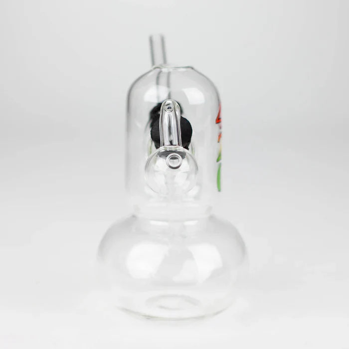 The 6" Oil Rig Sticker Round is a compact soft glass skull-themed oil rig designed for concentrates and essential oils, featuring a straight downpipe for improved diffusion and an extended mouthpiece for comfortable draws, with collectible sticker graphics that vary per piece.