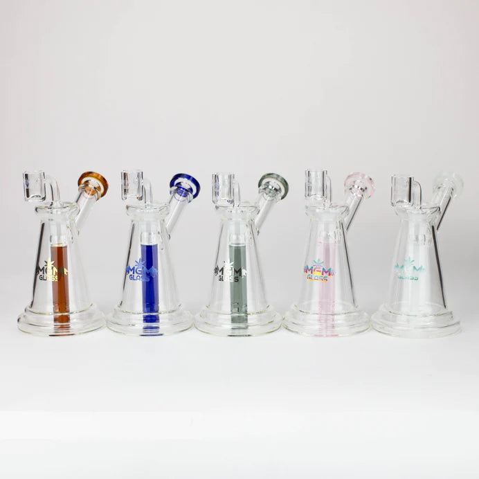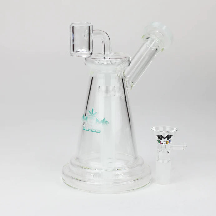 This 5.7" 2-in-1 bubbler is made out of strong borosilicate glass with a wide 70mm base and 3.5mm thickness. Its stemless, bent neck design looks great. Featuring a unique frog-and-leaf logo. The quartz banger and 14mm female joint provide a comfortable and efficient smoking experience.