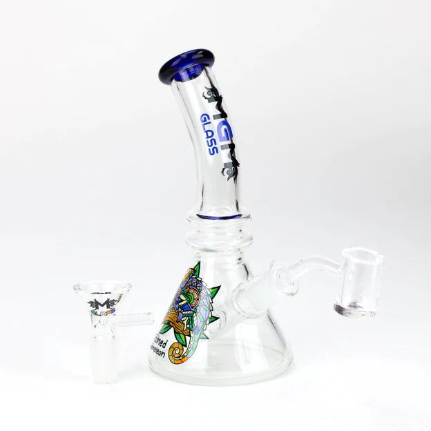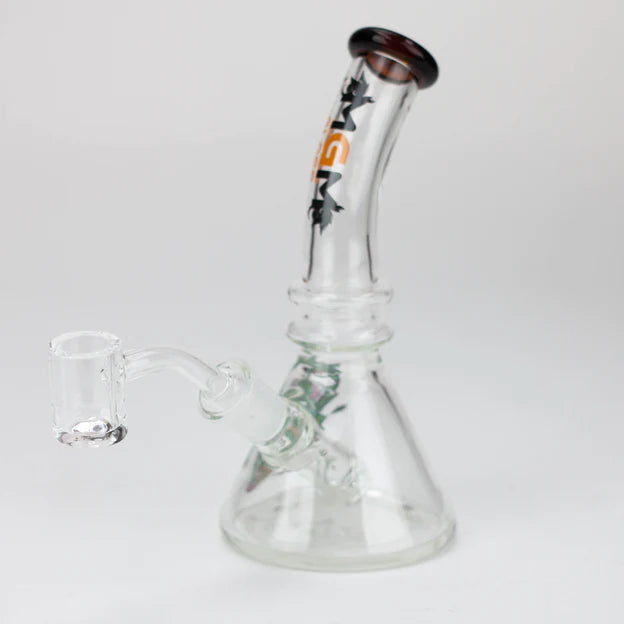 A beautifully shaped bubbler rig from MGM. Featuring a graphic on the side of the glass. Bubbler comes complete with a quartz banger for 14mm female Joint and Thick bowl for 14mm female Join for your favourite concentrates.