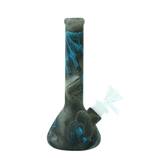 This Blue 8″ Silicone Beaker Bong sits at 8” tall and made from silicone. This water pipe is sure to dazzle the senses with its skeleton imagery. The silicone material helps prevent breakage.