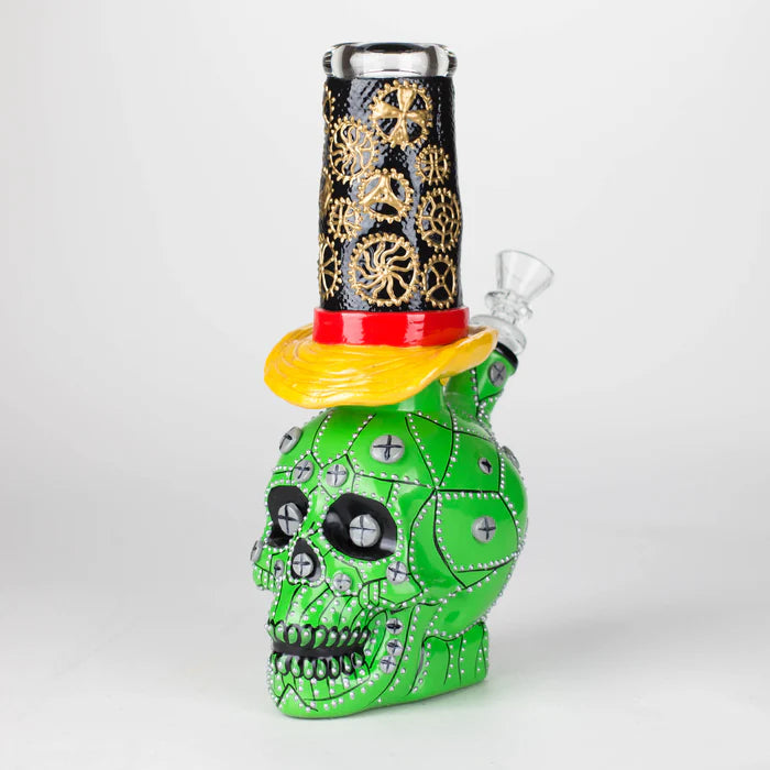 This 9" Wizard Sugar Skull Themed Glass Bong, It has a skull shaped base and the downstem is shaped like a wizard designs.