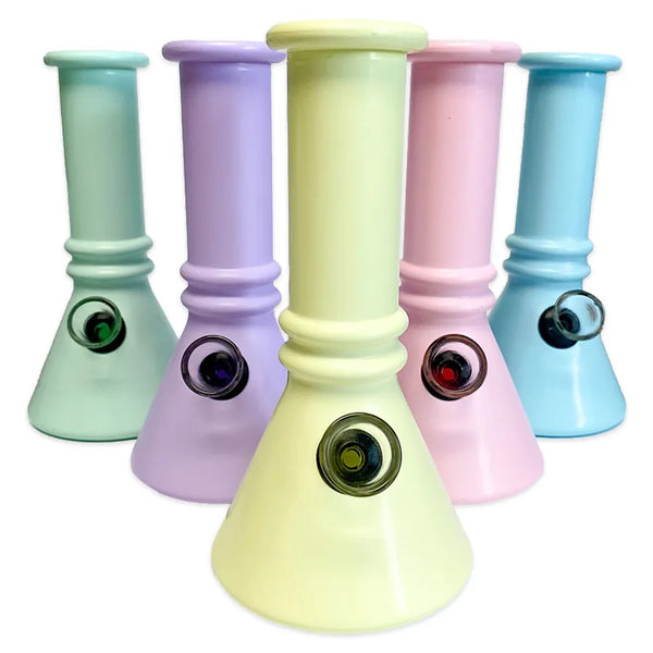 The cutest Double Ridge 6" Mini Glass Beaker Bong. Portable, vibrant, and functional. These 6" pieces come in beautiful pastel colours and pack everything you need from a bong in a small but mighty package.