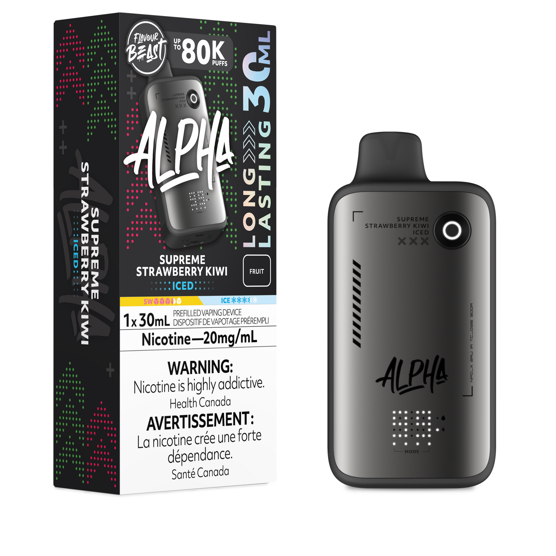 The Flavour Beast Alpha Disposable Vape is a large capacity 30mL 80K disposable providing the highest rated puff count device from flavour beast to date. Alpha has 4 power levels of intense E-Juice to customize each puff. Battery and liquid levels can be viewed on the minimalist DOT Matrix display.