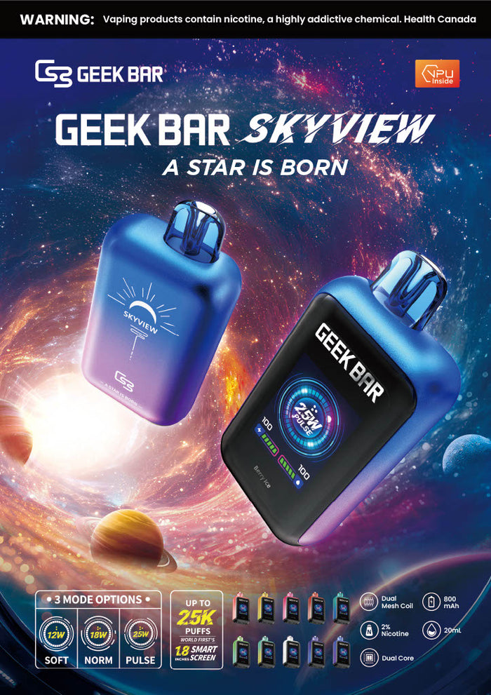 The Geek Bar Skyview 25000 Puff Disposable Vape 20ml takes only 20 minutes to charge the 800mAh battery from 0% to 80%, so you will have less down time charging. Also with just one click on the bottom of the Skyview device, you can adjust the power from soft mode 12w, Normal mode 18w, and Pulse mode 25w. This GeekBar comes prefilled with 20mL of 20mg/mL of nicotine salt e-juice, The Geek Bar Skyview also has 5 UI design interfaces with its 1.8 inch screen showing power regulation and charging progress.