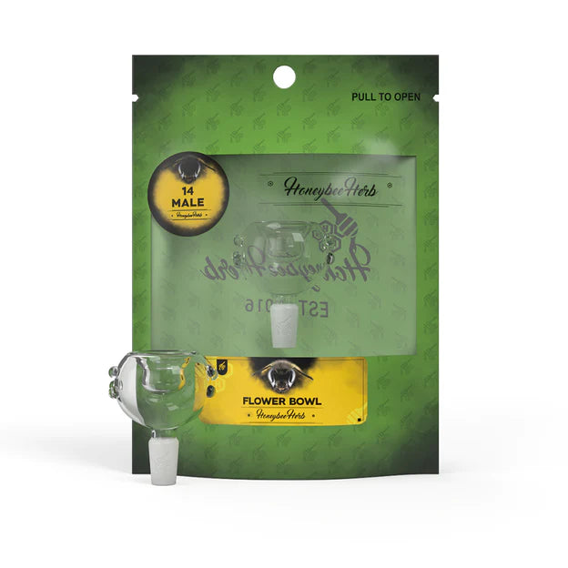 The Honeybee Herb Glass Flower Bowl comes in at a Length of 2" and is made Durable glass. The Bowl is made for 14mm female joints.