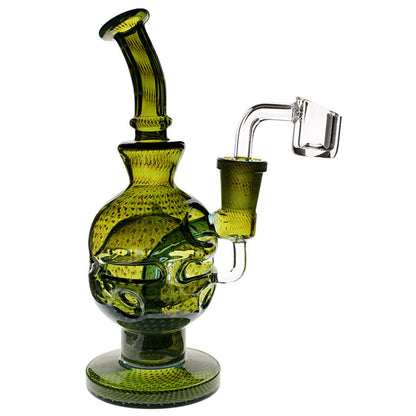 The Plain Jane Glass 7" Milky Egg Rig. This rig has an indented bubble shape. The glass egg on the inside holds a disc percolator attached to a fixed downstem. The rig comes with a domeless banger. The teal and yellow colours are more milky and have more hints of blue in them.