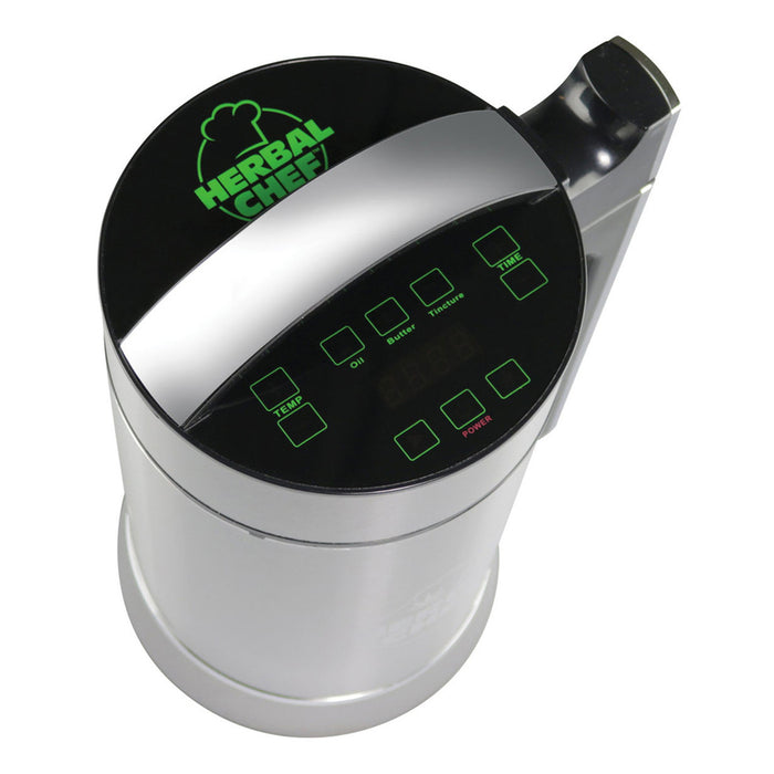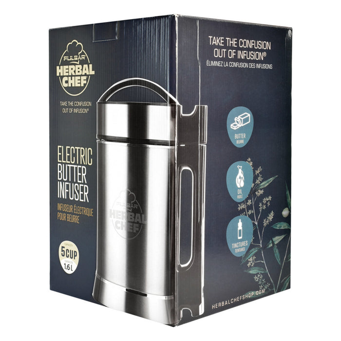 This Pulsar Herbal Chef Electronic Butter Maker Infuser works with up to 5 Cups of butter, oil, or tincture base for potent cannabis infusions! Now with less time, waste & mess than traditional DIY methods, this easy-to-use tool creates butter, oil, and tincture infusions in as little as 10 minutes! Features include easy-to-clean design, digital readout, push-button controls, and preset infusion modes for butter, oil and tincture (manual override for customer settings). Limited 1-year warranty.